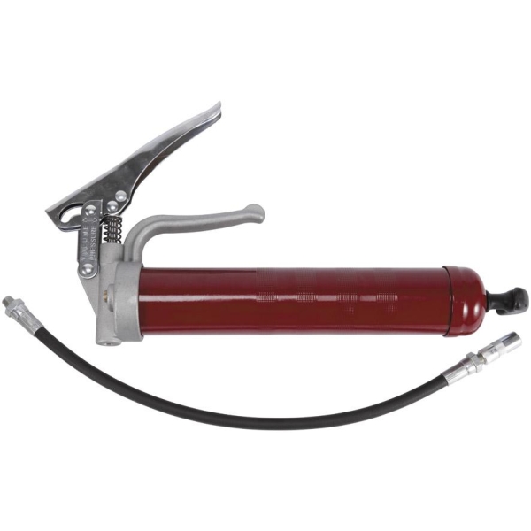 Profesjonell og kraftig presse som tåler arbeidstrykk opp mot 517 bar. For 400 g patron eller løsfett. Leverer ca 0,85 g fett pr pumpetrykk. Utvekslingsarm for mengde-og trykkpumping. Smøreslange og 4 klørs munnstykke leveres som standard