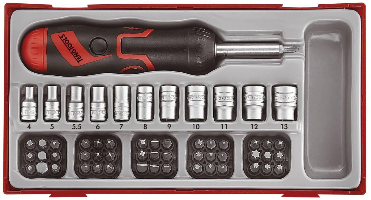 Leveres i innbyggingsboks av plast med avtagbart lokk. Passer i Teng Tools verktøykasser og -vogner.
