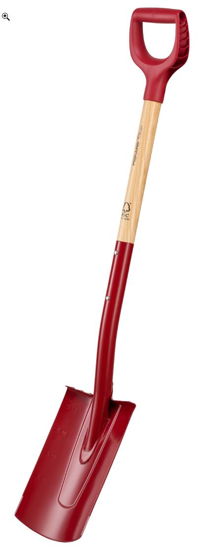 Fiskars Classic rett spaden har et slipt stålblad som er ideelt for kantarbeid og for planting av trær og busker. Hodet i forsterket stål har slipt tupp og kanter for optimal graving og har dybdemarkeringer for presisjon og nøyaktighet.