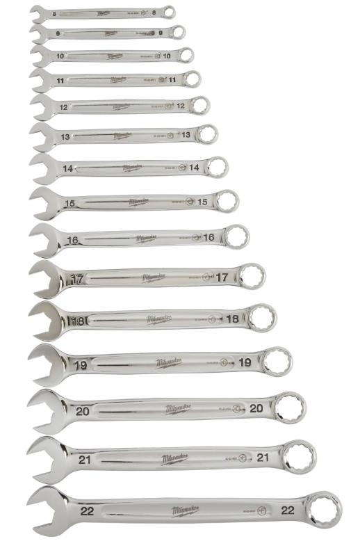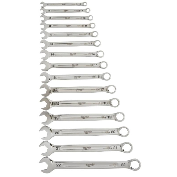 MaxBite åpen kjeve for sikkert grep rundt bolter. Avrundet håndtak for komfortabelt grep. Oppbevaring; 7 delers sett med bærehåndtak og 15 delers sett i i brett for oppbevaring på hylle eller skap. Tydelig markering for beste lesbarhet. 15° sidestilt rekke for beste tilgjengelighet. Kromlegert stål med forkrommet overflate. 8, 9, 10, 11, 12, 13, 14, 15, 17, 18, 19, 20, 21, 22 mm.