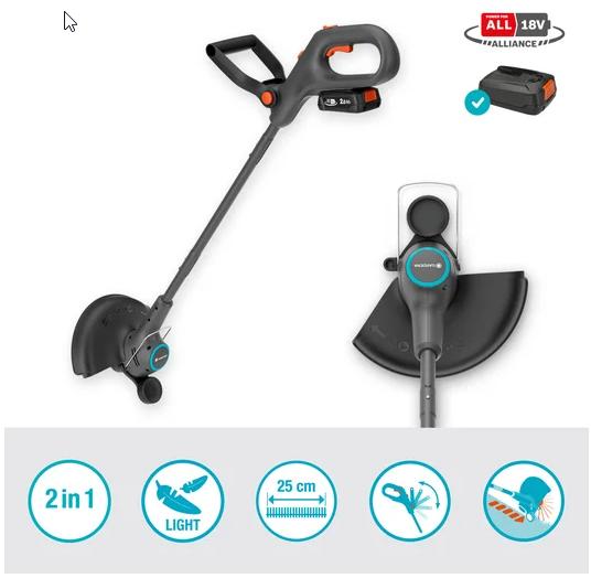 Inkludert: 1x GARDENA EasyTrim 25, 1x Systembatteri P4A PBA 18V/36 2Ah, 1x Lader P4A AL 1810 CV