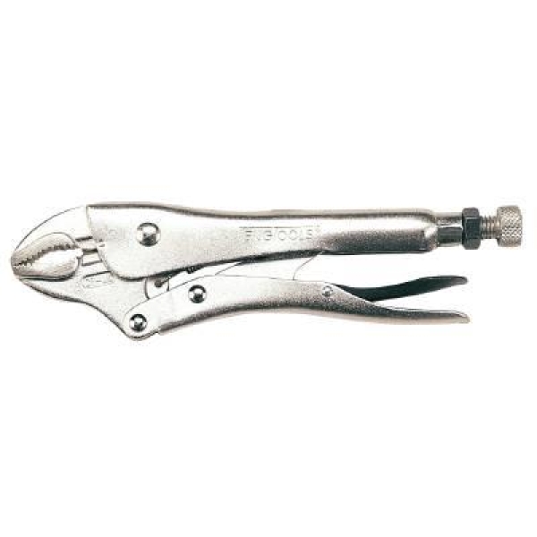 Selvlåsende. Riflet, stillbare kjefter med rørgrep og avbiter. Med utløserarm. Forniklet.