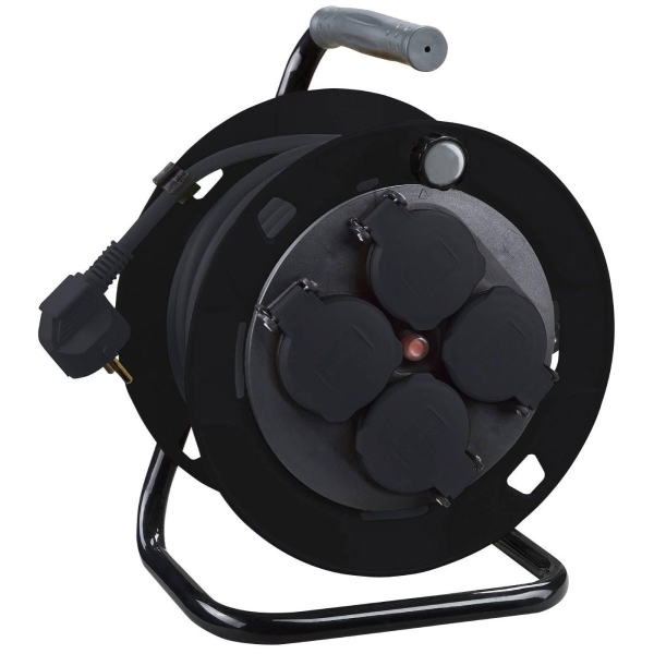 Kompakt kabeltrommel med 4 uttak, utstyrt med overopphetingsvern og selvstengende lokk. Godkjent for utendørs bruk.