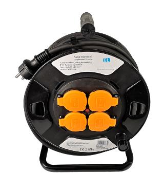 Kabeltrommel med 25 meter gummikabel. 4 uttak med lokk, jord og barnesikring. Thermosikring mot overbelastning. IP44. 3 x 2.5 mm². Kabeltype: H07RN-F3G2.5. 230V 16A. Maks kapasitet: 3600 watt utrullet og 1300 watt sammenrullet.