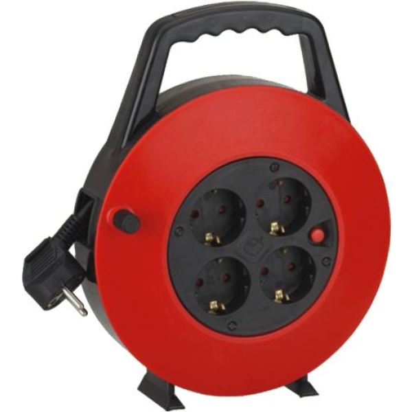Kabeltrommel med 10 meter kabel og 4 uttak. Jordet kabel og barnesikring på kontaktene. For innebruk. Termosikring mot overbelastning. PVC-kabel 3×1.0mm². H05VV 10M. 230V~16A. Maks: 2300W utrullet og 900w på rull. CE, SEMKO og ROHS godkjent.