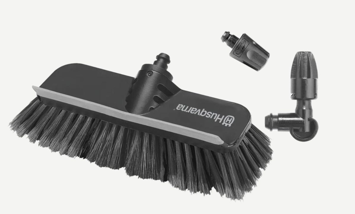 Bilsettet består av et vidt munnstykke for rask og skånsom rengjøring av følsomme overflater, et vinklet munnstykke for områder som er vanskelige å komme til, og en vaskebørste med nal.