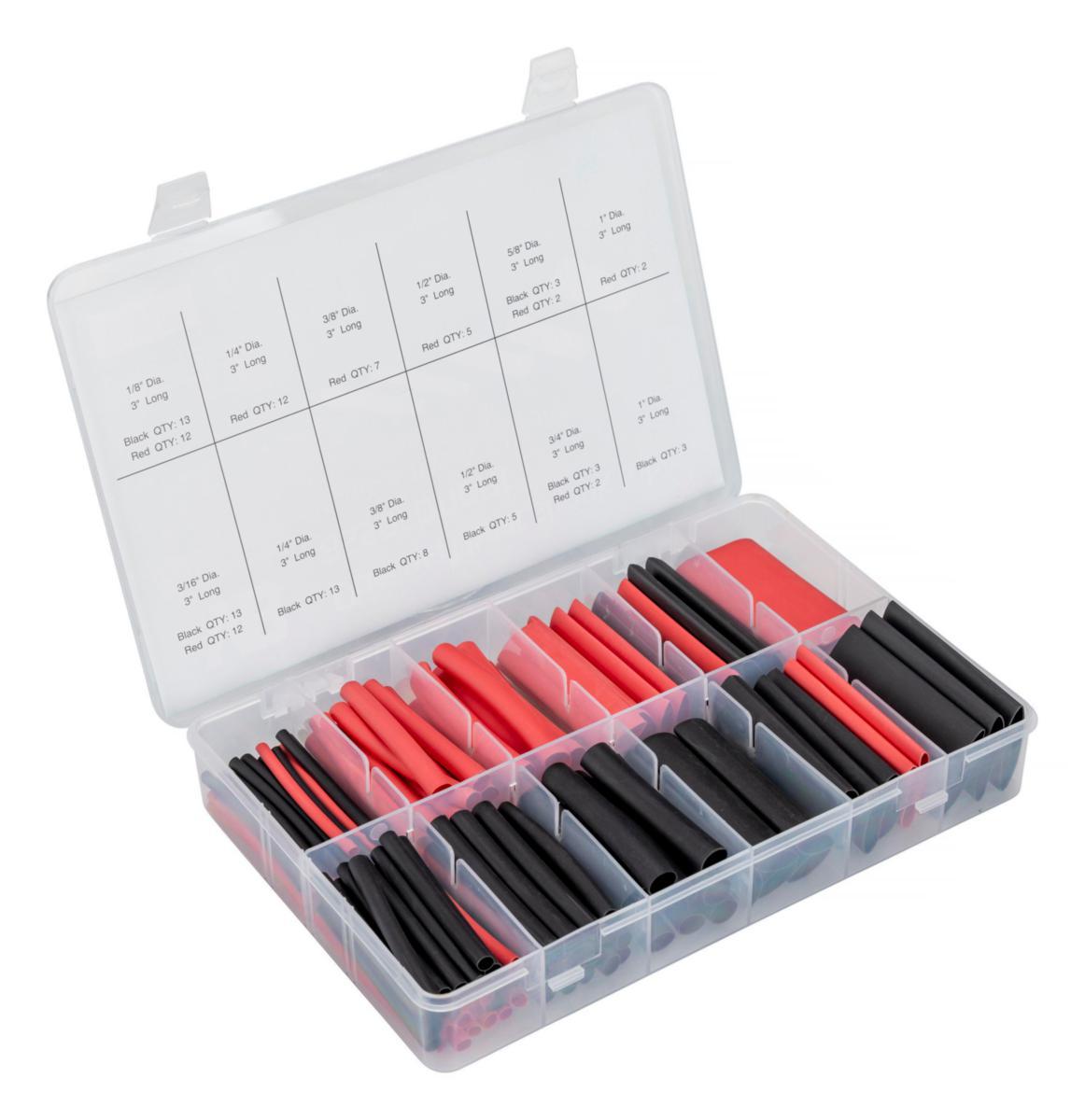 Innhold: 25 stk Ø1/8″ (3,2 mm), 25 stk Ø3/16″ (4,8 mm), 25 stk Ø1/4″ (6,4 mm), 15 stk Ø3/8″ (9,5 mm), 10 stk Ø1/2″ (12,7 mm), 5 stk Ø5/8″ (15,9 mm), 5 stk Ø3/4″ (19 mm) og 5 stk Ø1″ (25,4 mm). Inneholder totalt 115 stk krympeslange.