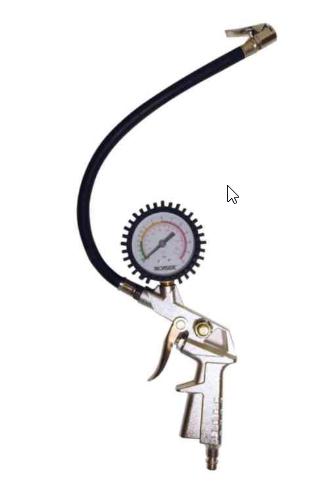 For bildekk, slangediameter R 1/4″ Med pistolhåndtak. Trykkmåleren er utstyrt med sikkerhetsglass og beskyttelsesdeksel av gummi. Arbeidstrykk: 0 – 10 bar Leveres med 1/4″ slangenippel