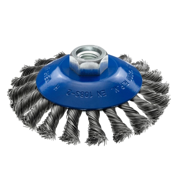 Buet børste egnet for krevende rengjøringsarbeid. Universelt anvendelig og ideell for bearbeiding på vanskelig tilgjengelige steder. Brukes på både faste og portable maskiner. Disse børstene har en høy avvirkningsgrad. Børstene tåler høye turtall og har lang levetid. Tvunnet ståltråd.
