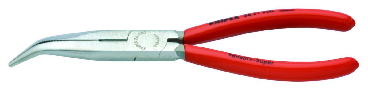 Enkelt ledd. Lange, bøyde kjefter 45°. Riflet gripeflate. Polert. Med plastbelagte håndtak. Spissenes lengde 73 mm. Tang m/ sideavbiter.