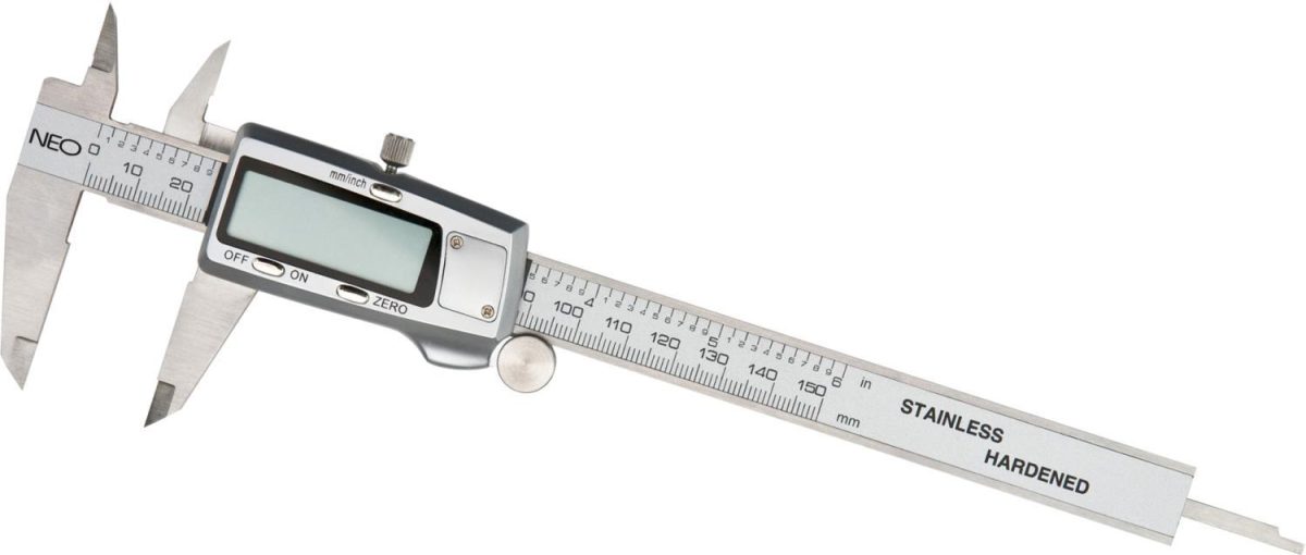 For inn- og utvendig måling, dybder og forskyvninger. Laget i rustfritt stål. Med strammeskrue. Måleområde: 0-150mm. Nøyaktighet +/- 0,02mm. Tydelig display for enkel avlesning. Produktets pålitelighet bekreftes med 25 års garanti. NEO-merke oppfyller forventningene til fagfolk.
