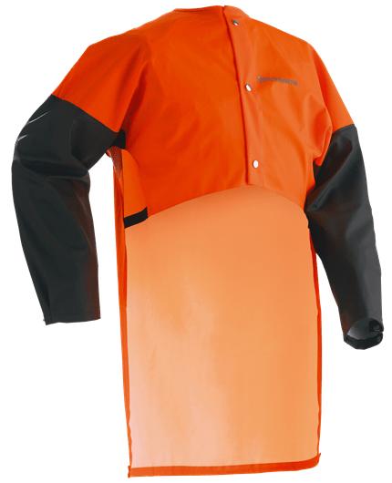 Ryggbeskytter laget i PU/PVC. Praktisk modell med justerbar knepping foran, og ekstra lange ermer med trykknapper. Forlenget rygg med “regnrenne”.