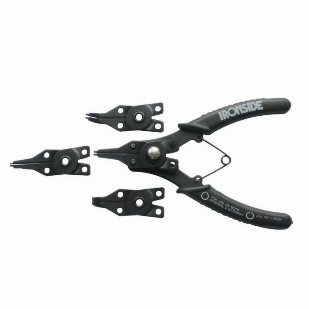 Seegerringstang i kombinasjonsmodell med utskiftbare kjever. Den er designet for å håndtere både indre og ytre størrelser mellom 10-50 mm med 180°, 90° og 45°. Dette verktøyet leveres med fire utskiftbare kjever, som gir fleksibilitet og bekvemmelighet for ulike oppgaver.