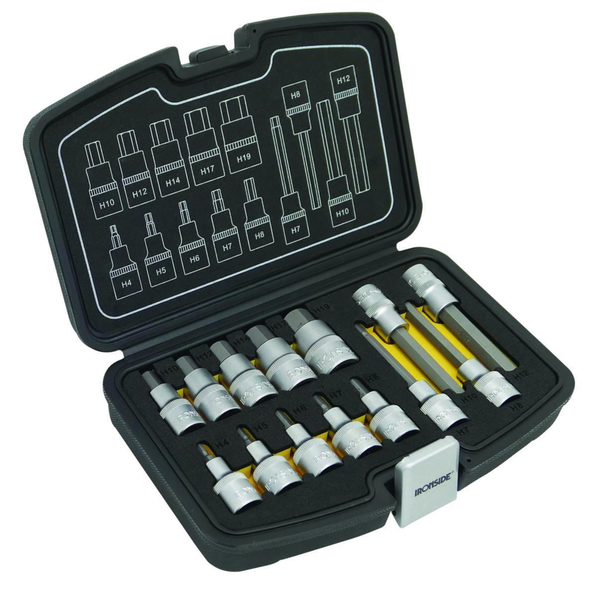 Mattforkrommet kromvanadiumstål. Korte og lange bitspiper for innvendig sekskant. 1/2” feste. Inneholder 10 stk bitspiper hex 55mm, 4, 5, 6, 7, 8, 10, 12, 14, 17, 19 mm, samt 4 stk lange bitspiper hex 100mm, 7, 8, 10, 12 mm. Leveres i robust plastboks med metallspenne.