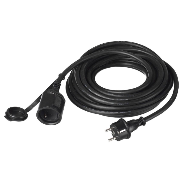 Gummikabel laget med ekstra kraftige uttakskontakter som tåler slag og støt. 16A/230V. Isolasjonsklasse IP44. Godkjent for utendørs bruk.