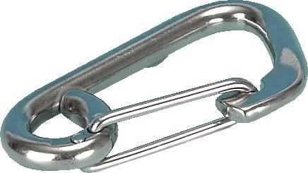 Taukrok (karabinkrok) i syrefast stål. Stort gap i forhold til størrelsen. Ingen skarpe kanter eller små fjærer som kan gå i stykker.