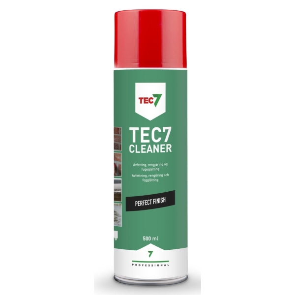 TEC7 CLEANER er et universalt rense-, avfettings- og fugeglattemiddel som fordamper uten å etterlate oljefilm. Avfetting og rengjøring av petroleumsbasert forurensing, og fjerner uherdet fugemasse og byggskum, fersk oljemaling, lim, limrester fra klistremerker og etiketter, fett, olje, tjære, stearin, skismøring, kvae etc. Ved glatting av fuger gir den et pent sluttresultat på synlige overflater.