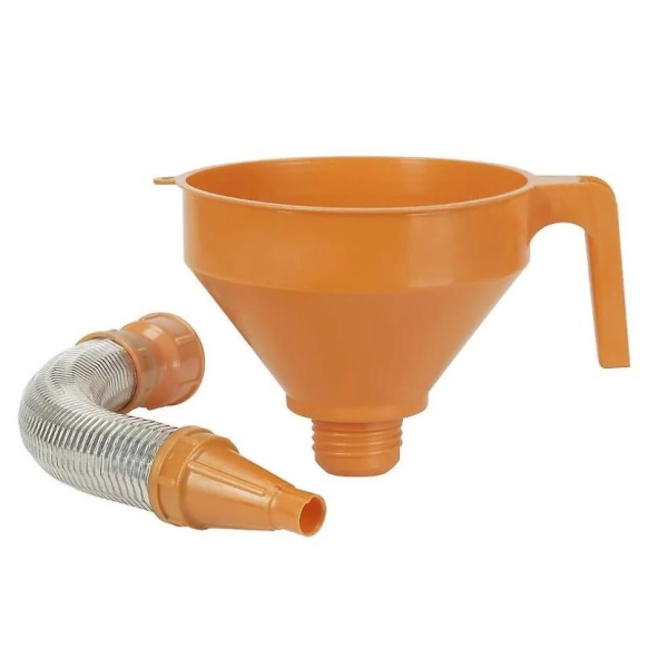 Av polyetylen med fleksibel metalltut (avtagbar og utbyttbar). Overløpsrand og håndtak. Kjemikalie-, olje-, syre- og drivstoffbestandige. Med sil.