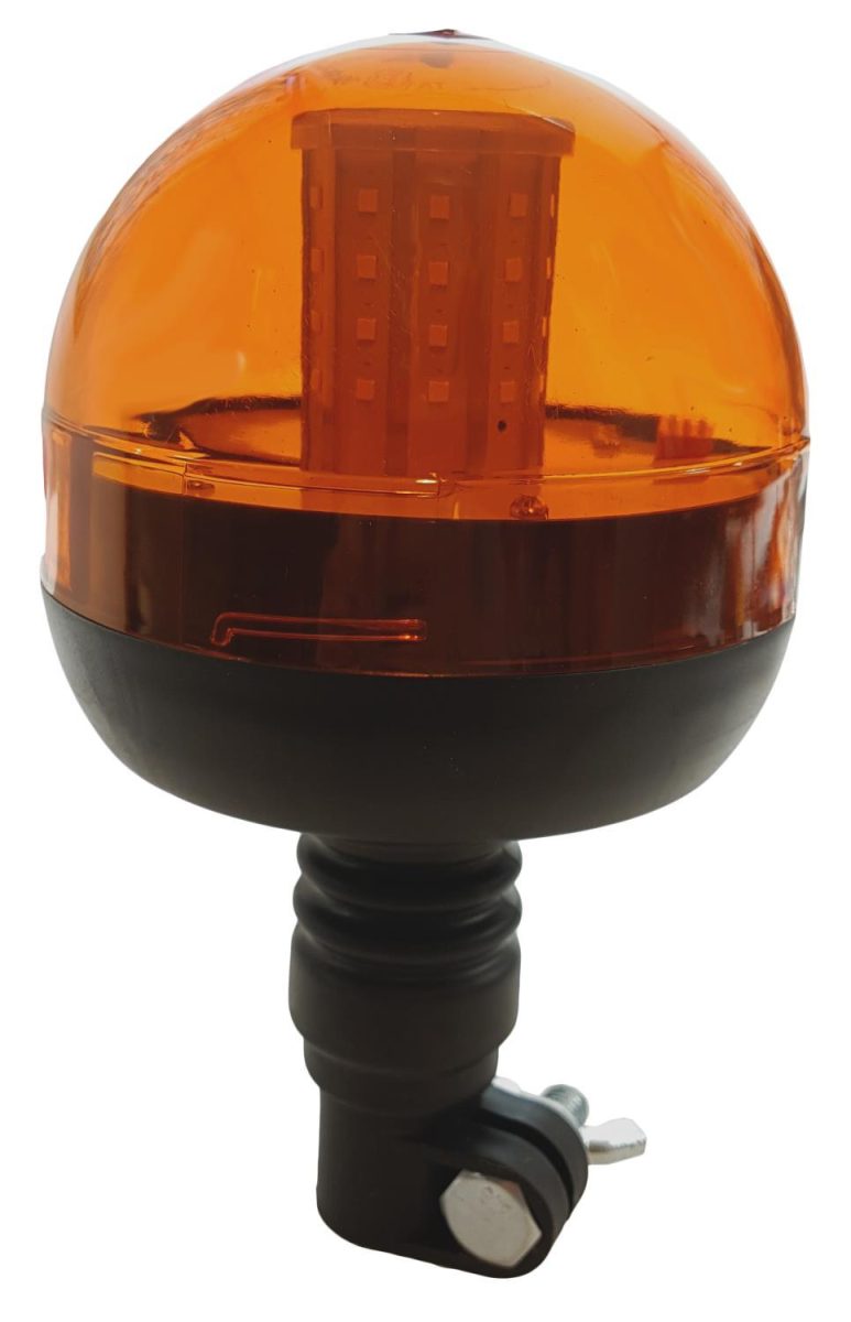 Kompakt roterende varsellampe i LED med gummiert fot. Orange. Gummifoten er fleksibel og er tilpasset montering på pigg. Polykarbonat glass. SMD LED. IP65. 10-30V. E-Merket. Str. Med fot: 126 x 205 mm (B x H) Str. Kun lampe: 126 x 111 mm (B x H)